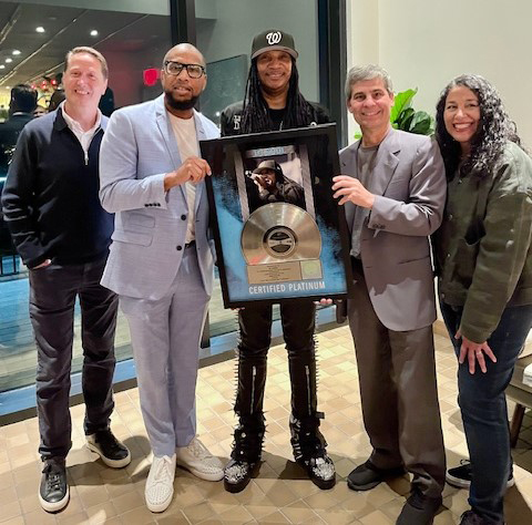 In October, 2024, firm client DJ Kool received a platinum award plaque for his classic single “Let Me Clear My Throat”. Pictured (left to right): Mitch Glazier (CEO of RIAA), Walt Reeder, Jr. (DJ Kool’s manager), DJ Kool, Bernard Resnick, and Michele Ballantyne (President of RIAA). — Photo by Khalid Najil